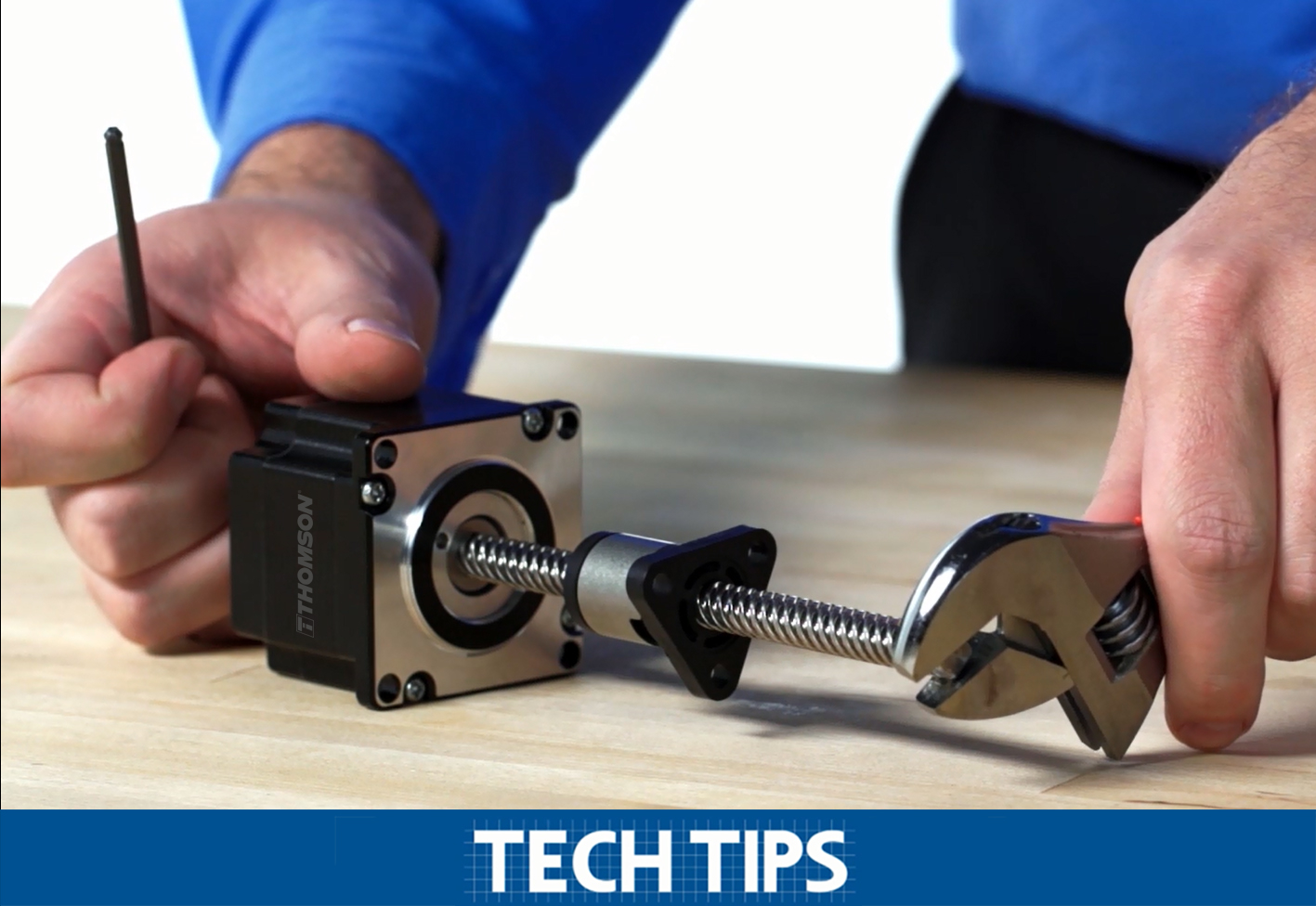 Jonathan demonstrates how to service a Thomson Motorized Lead Screw in the field, he says: “Loosen the cap on the lead screw, once the threads disengage it is easy to pickup the assembly and remove the lead screw from the motor. The taper on the lead screw rests into the motor shaft, to re-assemble, simply place the lead screw back into the motor and tighten down the cap screw.”