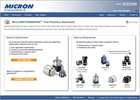 03-16-2016 - WOOD DALE, IL – Thomson Industries, Inc., a leading manufacturer of mechanical motion control solutions, has expanded its web-based sizing and selection tool for Micron® TRUE Planetary? Gearheads. The web-based MicronMOTIONEERING® is a unique, application-based sizing and selection tool that quickly and easily identifies the correct planetary gearhead for your application. The improved MicronMOTIONEERING® interface and expanded product offering allows users to save time and boost confidence in knowing that they’ve selected the optimal gearhead for their motion control application.